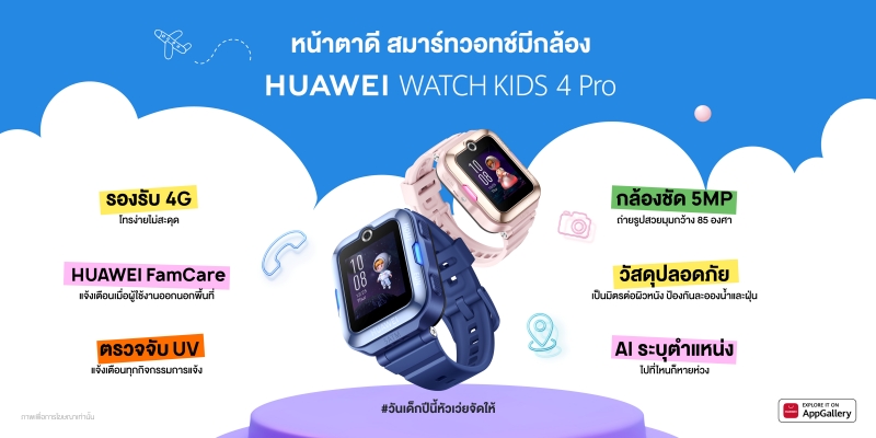 มาในดีไซน์ที่สดใสและสนุกสนานอัดแน่นด้วยเทคโนโลยีติดตั้งกล้องในตัวความละเอียด 5 MP ที่สามารถถ่ายรูปและวิดีโอคอลได้คมชัดระดับ HD รองรับการใช้งานนาโนซิมการ์ด 4G รับสายและโทรออกได้โดยตรงผ่านสมาร์ทวอทช์โดยไม่จำเป็นต้องเชื่อมต่อกับสมาร์ทโฟน รองรับระบบติดตามตำแหน่ง 9 ระบบ ที่จะทำงานร่วมกับเทคโนโลยี Network Positioning Algorithm ซึ่งพัฒนาโดยหัวเว่ย ทำให้สามารถตรวจจับและระบุตำแหน่งของเด็กๆ ได้อย่างแม่นยำ และจะส่งสัญญาณแจ้งเตือนผ่านแอปพลิเคชัน HUAWEI FamCare หากเด็กๆ กำลังไปในสถานที่ผิดแปลกไปจากเส้นทางเดิม พร้อมโหมดออกกำลังกายกีฬาฮิตและมาตรฐานกันน้ำ 5 ATM ส่งเสริมให้เด็กๆ ทำกิจกรรมกลางแจ้งเพื่อพัฒนาการที่ดีของทั้งสมองและร่างกาย HUAWEI Watch Kids 4 Pro ราคาเพียง 4,799 บาท จากปกติ 6,490 บาท พร้อมรับฟรีตุ้กตา Baby Panda มูลค่า 649 บาท (เพียง 30 ออเดอร์แรก) เมื่อสั่งซื้อตั้งแต่ 8 มกราคม 2566 ถึง 11 มกราคม 2566 ที่ HUAWEI Store และร้านค้าอย่างเป็นทางการของหัวเว่ยบน Shopee และ Lazada