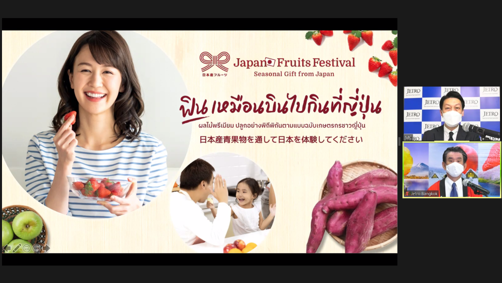 นายอัทสึชิ ทาเคทานิ ประธานเจโทร กรุงเทพฯ กล่าวถึงแนวคิดที่มาและความคาดหวังต่อการดำเนินโครงการว่า “ก่อนอื่นผมขอขอบคุณผู้เกี่ยวข้องทุกฝ่ายทั้งไทยและญี่ปุ่น ที่มีส่วนสำคัญทำให้โครงการนี้เกิดขึ้น ประเทศญี่ปุ่นส่งออกผลิตภัณฑ์อาหารมายังประเทศไทยมากเป็นอันดับ 7 ของโลก โดยในปี 2563 มีมูลค่าถึง 40,100 ล้านเยน (ประมาณ 11,460 ล้านบาท) ก่อนการแพร่ระบาดของโควิด-19 ชาวไทยจำนวนมากเดินทางไปเที่ยวประเทศญี่ปุ่นและได้ลิ้มลองเพลิดเพลินไปกับรสชาติอาหาร ผลไม้ ขนมต่างๆ แบบฉบับต้นตำรับญี่ปุ่นแท้ๆ ส่งผลให้กระแสความนิยมอาหารญี่ปุ่นของคนไทยเพิ่มขึ้นอย่างต่อเนื่อง แม้ในท่ามกลางสถานการณ์การระบาดของโควิด-19 ในปัจจุบัน มูลค่าการส่งออกผลิตภัณฑ์อาหารมายังประเทศไทยกลับเติบโตสูงขึ้นมากกว่าปีที่ผ่านมา แคมเปญนี้มุ่งเน้นประชาสัมพันธ์ไปยังกลุ่มผู้บริโภคชาวไทยได้มีประสบการณ์และมีโอกาสรู้จักกับผลไม้ญี่ปุ่นคุณภาพพรีเมียมที่มีเอกลักษณ์ความอร่อยตามแต่ละฤดูกาล และกลายมาเป็นแฟนพันธุ์แท้ของผลไม้ญี่ปุ่นในอนาคต ผมหวังว่าโครงการนี้จะเป็นส่วนหนึ่ง ที่ช่วยเชื่อมสัมพันธ์ไทย-ญี่ปุ่นให้แน่นแฟ้นยิ่งขึ้นไปด้วย”