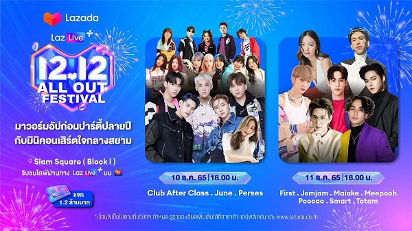 และในวันที่ 12 ธันวาคมนี้ ลาซาด้าพร้อมเนรมิตลานกิจกรรม Block I สยามสแควร์ ให้เป็นพื้นที่สำหรับแฟชั่นโชว์และคอนเสิร์ตสุดยิ่งใหญ่ที่รวมศิลปินกว่า 50 ชีวิต ในงาน Lazada 12.12 LazLive+ Festival โดยร่วมกับแบรนด์พันธมิตรอย่าง Bata และ Samsung พร้อมด้วยเหล่านางแบบระดับแถวหน้าของวงการ นำโดย แพนเค้ก-เขมนิจ นางเอกดีกรีซูเปอร์โมเดล, เต-ตะวัน, นุนิว-ชวรินทร์, ซี-พฤกษ์, หนุ่ม ๆ จาก LaziCON และ LAZ1 พร้อมด้วยแบรนด์แอมบาสเดอร์ของลาซาด้าอย่าง พีพี-กฤษฏ์ และ บิวกิ้น-พุฒิพงศ์ ที่จะมาร่วมเดินแฟชั่นโชว์สุดพิเศษบนเวที ต่อด้วยคอนเสิร์ตปิดท้ายจากวงบอยด์แบนด์มาแรงอย่าง ATLAS, Trinity และแบรนด์แอมบาสเดอร์อย่าง ไบร์ท-วชิรวิชญ์ และ วิน-เมธวิน ที่จะมาสร้างสีสันบนเวทีในครั้งนี้ด้วย แฟน ๆ ลาซาด้าสามารถลุ้นรับสิทธิ์พิเศษเพื่อเข้าชมแฟชั่นโชว์และคอนเสิร์ตได้ โดยร่วมกิจกรรมบนแอปพลิเคชัน รวมถึงช่องทางโซเชียลมีเดียของลาซาด้า หรือจะรับชมไลฟ์ผ่าน LazLive+ บนแอปพลิเคชัน ตั้งแต่เวลา 17.00 น. ถึง 21.00 น. ในวันที่ 12 ธันวาคม ได้เช่นกัน