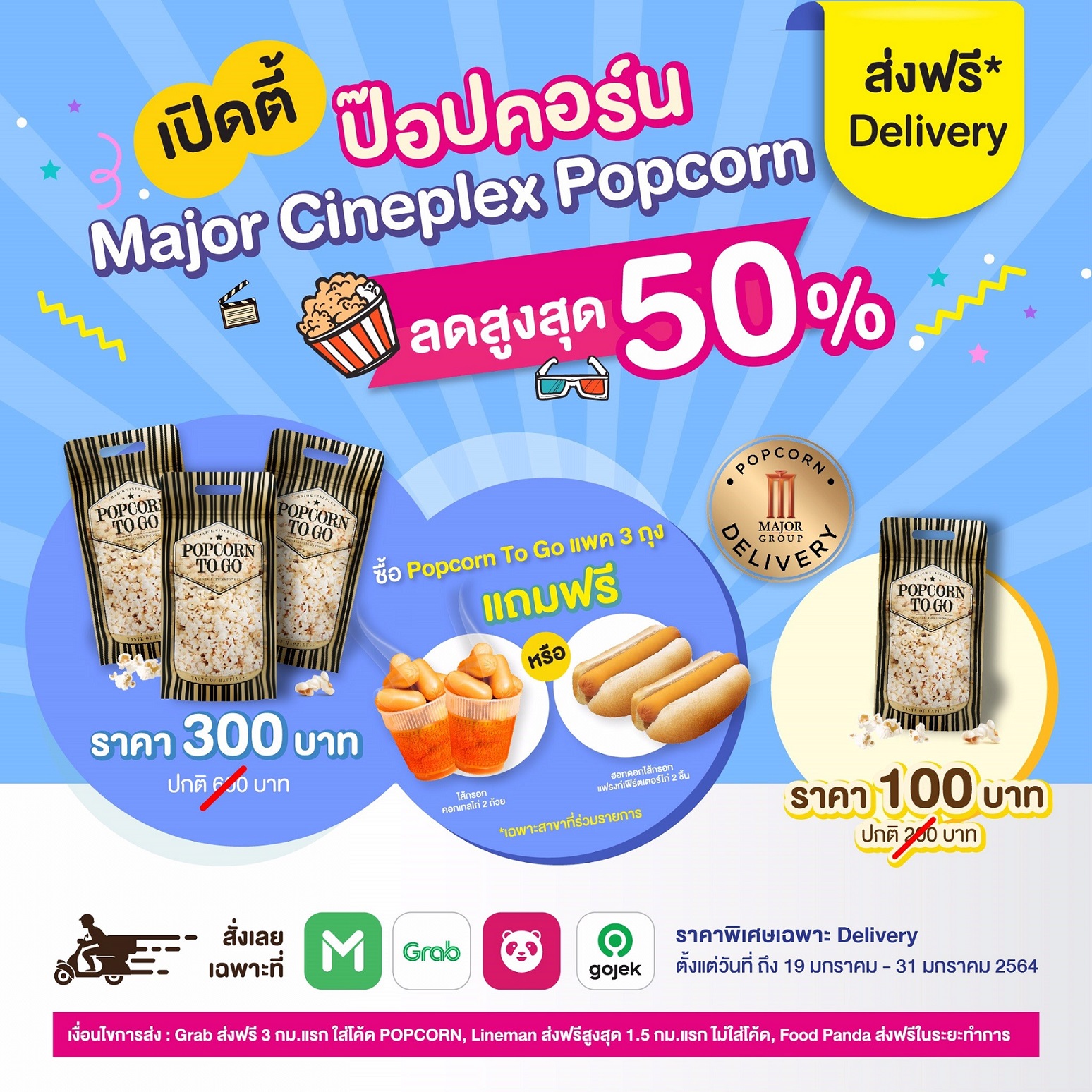ป๊อปคอร์นโรงหนัง เอกลักษณ์ความอร่อยที่ไม่เหมือนใคร เมเจอร์ ซีนีเพล็กซ์ กรุ้ป พร้อมตอบรับไลฟ์สไตล์ความต้องการของลูกค้าได้ในทุกที่ ทุกช่วงเวลา ด้วยบริการ Major Delivery ไม่ว่าจะคุณจะทำงานที่ Office หรือ จะ Work from home หรือ หยุดเรียนออนไลน์ ก็สามารถสั่งตรงความอร่อยของป๊อปคอร์นได้ง่าย ๆ ผ่านแอปพลิเคชั่นสั่งอาหารออนไลน์ชั้นนำอย่าง Grab Food, LINE MAN, foodpanda และ GOJEK ด้วยโปรจัดหนัก! ลด 50% ตั้งแต่วันที่ 19-31 มกราคม 2564 กับ 2 เมนูความอร่อย