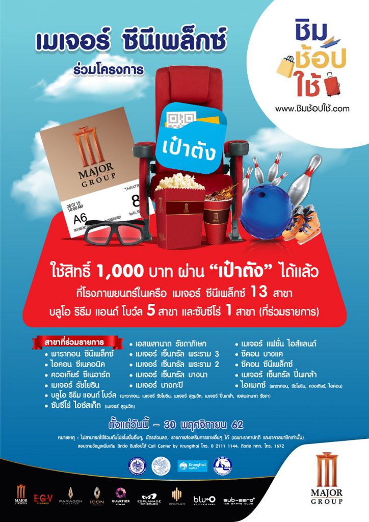 นรุตม์ เจียรสนอง รองประธานเจ้าหน้าที่บริหารฝ่ายการตลาด บริษัท เมเจอร์ ซีนีเพล็กซ์ กรุ้ป จำกัด (มหาชน) เปิดเผยว่า บริษัทฯ ได้เข้าร่วมโครงการ ชิม ช้อป ใช้ ซึ่งเป็นมาตรการกระตุ้นเศรษฐกิจของทางรัฐบาล เพื่อเป็นอีกหนึ่งทางเลือกให้ประชาชนที่ได้รับเงิน 1,000 บาท จากโครงการ ชิม ช้อป ใช้ ผ่านแอพเป๋าตัง ของธนาคารกรุงไทย สามารถนำมาใช้จ่ายได้ที่ โรงภาพยนตร์ในเครือเมเจอร์ ซีนีเพล็กซ์ กรุ้ป ในกรุงเทพฯ 13 สาขา ได้แก่ เมเจอร์ ซีนีเพล็กซ์ สาขารัชโยธิน, เซ็นทรัล ปิ่นเกล้า, เซ็นทรัล พระราม 2, เซ็นทรัล พระราม 3, เซ็นทรัล บางนา, แฟชั่น ไอส์แลนด์, โลตัส บางกะปิ, พารากอน ซีนีเพล็กซ์, ไอคอน ซีเนคอนิค, ควอเทียร์ ซีเนอาร์ต, เอสพลานาด ซีนีเพล็กซ์ รัชดา, ซีคอน ซีนีเพล็กซ์, แกรนด์ อีจีวี ซีคอน บางแค และ โรงภาพยนตร์ไอแมกซ์ สาขารัชโยธิน, พารากอน ซีนีเพล็กซ์, ไอคอน ซีเนคอนิค และ ควอเทียร์ ซีเนอาร์ต