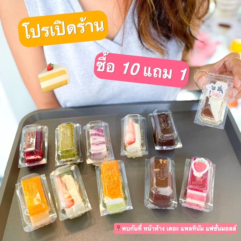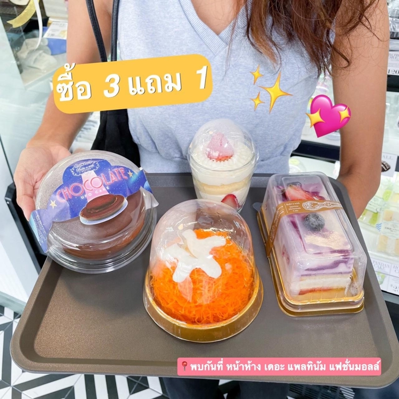 พิเศษช่วงแนะนำร้าน พบกับ 2 โปรโมชั่นอิ่มอร่อยสุดคุ้ม เมื่อซื้อเค้กชิ้นใหญ่ 3 ชิ้น แถมฟรี 1 ชิ้น และสำหรับใครที่ชอบลิ้มลองเค้กหลากหลายรสชาติแนะนำโปรโมชั่นซื้อมินิเค้ก 10 ชิ้น แถม 1 ชิ้น ทันที