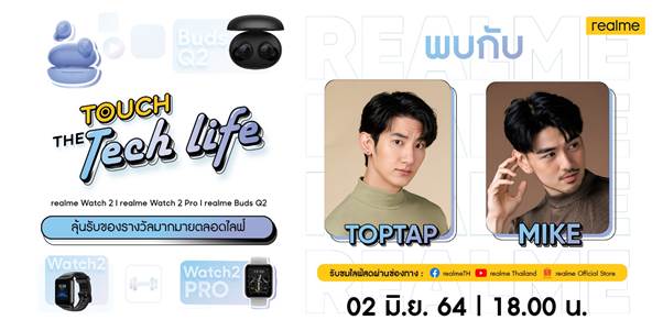 realme แบรนด์สมาร์ทโฟนเพื่อคนรุ่นใหม่ที่เติบโตเร็วที่สุดในโลก เตรียมเปิดประสบการณ์สุดล้ำ กับการเปิดตัวผลิตภัณฑ์ AIoT ในรายการ Touch The Tech Life จาก realme พร้อมด้วยพิธีกร 2 หนุ่มสุดฮอตอย่าง ท็อปแท๊ป-จิรกิตติ์ คูอาริยะกุล และ ไมค์-ชินรัฐ สิริพงษ์ชวลิต ที่จะมาร่วมสร้างสีสัน แนะนำผลิตภัณฑ์และพาลุ้นรับของรางวัลมากมายตลอดไลฟ์