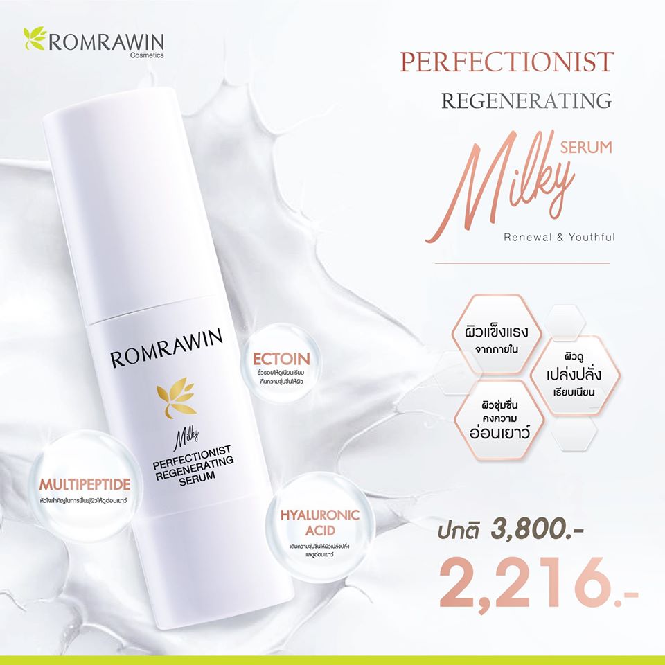 ถึงเวลาปลดล็อคผิวสวย เปล่งปลั่ง กระจ่างใสไร้ริ้วรอย รมย์รวินท์ ขอแนะนำผลิตภัณฑ์ Perfectionist Regenerating Milky Serum (เพอร์เฟ็คชั่นนิส–รีเจเนอร์เรติ้ง–มิลค์กี้–เซ–รั่ม) มหัศจรรย์เซรั่มน้ำนมที่พร้อมส่งมอบการบำรุงผิวได้อย่างล้ำลึก ด้วยส่วนประกอบสำคัญ Ectoin (เอ็ก–โต–อิน) ที่ช่วยปรับโครงสร้างตาข่ายผิวให้แข็งแรงขึ้น ผิวจึงกระชับ และ Multipeptide (มัล–ติ–เปป–ไท) ที่ช่วยเสริมสร้างคอลลาเจนและอิลาสตินใต้ชั้นเซลล์ผิว เหมาะสำหรับผู้ที่มีความกังวลในเรื่องริ้วรอย ผิวหย่อนคล้อยไม่กระชับ และ เหมาะสำหรับผิวแห้งเป็นพิเศษ เพียงเกลี่ยผลิตภัณฑ์ให้ทั่วบริเวณใบหน้าและลำคอ ทุกเช้า–เย็น ขนาด 30 ml. ราคาพิเศษ 2,216 บาท (จากราคาปกติ 3,800 บาท) ส่งฟรี วันนี้ – 30 มิถุนายน 2563 สามารถติดต่อและสอบถามได้ที่ Facebook : Romrawincosmetics หรือ Line : @romrawincosmetics
