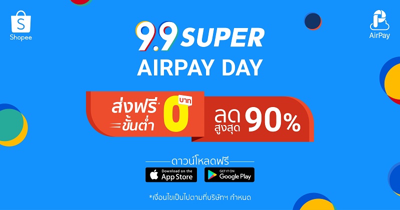 เพื่อเฉลิมฉลอง “Shopee 9.9 Super Shopping Day” จัดเซอร์ไพรส์ให้ยิ่งใหญ่กว่าที่เคย ผู้ใช้งานช้อปปี้ได้ช้อปสนุก จ่ายสะดวกไปกับแคมเปญ ‘AirPay Day’ ที่เตรียมมามอบโปรโมชั่นและดีลเด็ดมากมาย ได้แก่