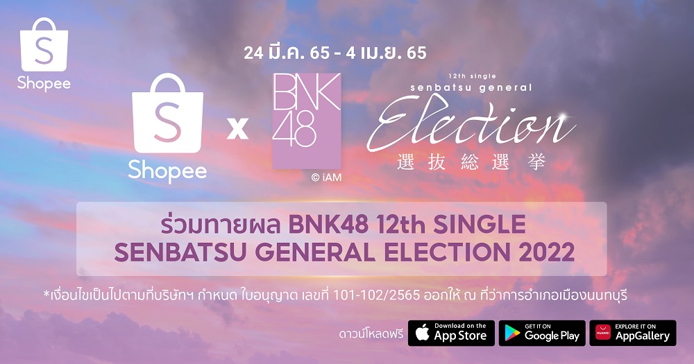 เพื่อเป็นการต้อนรับมหกรรม Shopee 4.4 Shocking Sale วันช้อป โปรช็อก พร้อมตอกย้ำความเป็นอีคอมเมิร์ซแพลตฟอร์มชั้นนำที่ขนความพิเศษมาแจกเยอะยืน 1 ให้กับเหล่านักช้อป ช้อปปี้ ผู้นำแพลตฟอร์มอีคอมเมิร์ซในเอเชียตะวันออกเฉียงใต้และไต้หวัน ร่วมกับ BNK48 จัดกิจกรรม “Shopee x BNK48 ร่วมทายผล BNK48 12th Single Senbatsu General Election 2022” ที่เปิดโอกาสให้แฟน ๆ ได้ร่วมทายผลการเลือกตั้งรายชื่อเมมเบอร์ที่จะได้เป็นเซ็มบัตสึ และเมมเบอร์ที่จะได้รับตำแหน่งเซ็นเตอร์ในซิงเกิลหลักลำดับที่ 12 เพื่อชิงรางวัลสุดพิเศษมากมาย อาทิ บัตร VIP Seat เพื่อเข้าร่วมงาน Grand Opening Single 12th Event โดยสาวก BNK48 สามารถร่วมสนุกกับกิจกรรมได้แล้วตั้งแต่วันที่ 24 มีนาคม 2565 เวลา 12.00 น. ไปจนถึงวันที่ 4 เมษายน 2565 เวลา 23.59 น. ซึ่งความพิเศษแบบนี้เอ็กซ์คลูซีฟเฉพาะที่ ช้อปปี้ ในฐานะพันธมิตรอีคอมเมิร์ซอย่างเป็นทางการเจ้าเดียวในประเทศไทยเท่านั้น!