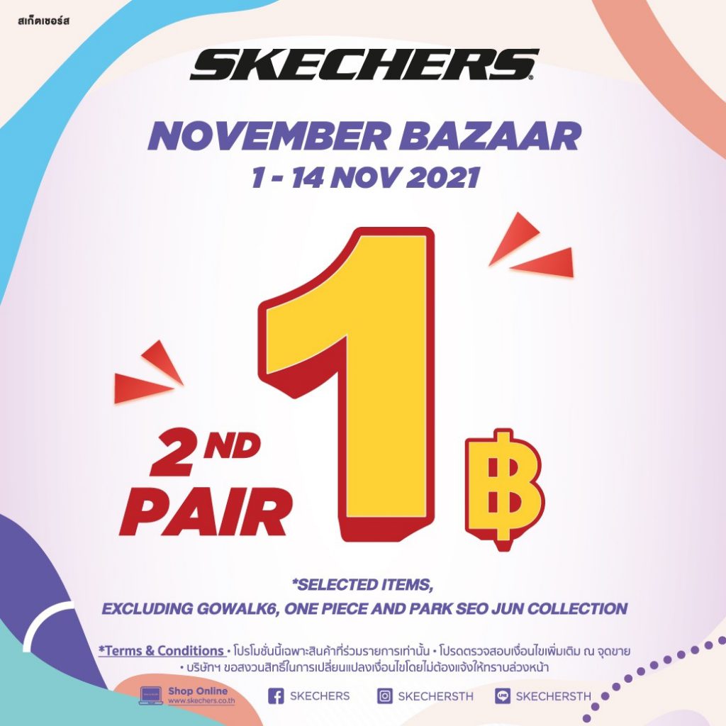 SKECHERS (สเก็ตเชอร์ส) แบรนด์กีฬาและไลฟ์สไตล์ชั้นนำสัญชาติอเมริกัน เซอร์ไพรส์ลูกค้าด้วยโปรโมชันแรงที่สุดที่เคยมีมากับแคมเปญ ซื้อชิ้นที่ 2 ในราคา 1 บาท – SKECHERS NOVEMBER BARZAAR BUY 1 GET ANOTHER 1 For 1฿ !! โดยมีสินค้าให้เลือกหลากหลาย ทั้งสินค้าไลฟ์สไตล์แฟชั่นรุ่นท็อป สินค้ากีฬาสายเพอร์ฟอร์แมนซ์ ตั้งแต่หัวจรดเท้า ทั้งเสื้อผ้า, หมวก, กระเป๋า และสนีกเกอร์รุ่นดัง รวมถึงสินค้าสำหรับเด็ก SKECHERS Kids ฯลฯ เพียงช้อปสินค้าใดก็ได้ 1 ชิ้น สามารถเลือกซื้อสินค้าอีก 1 ชิ้นในราคาพิเศษเพียง 1 บาทเท่านั้น!*