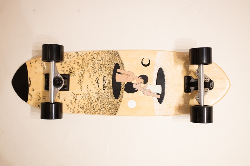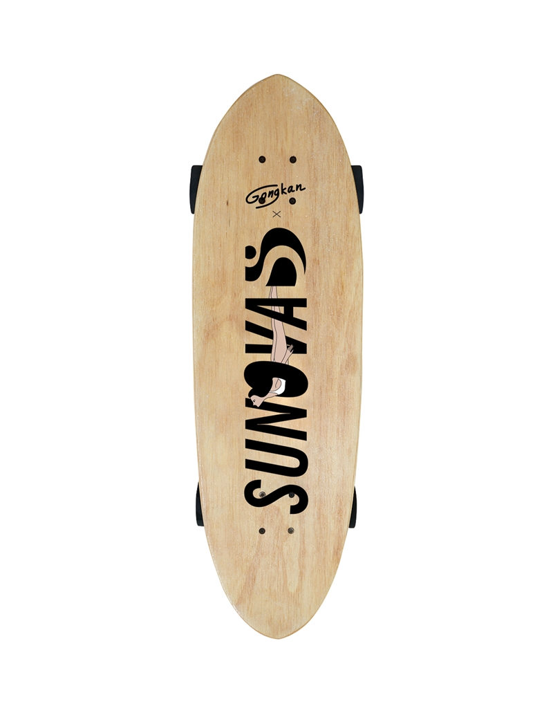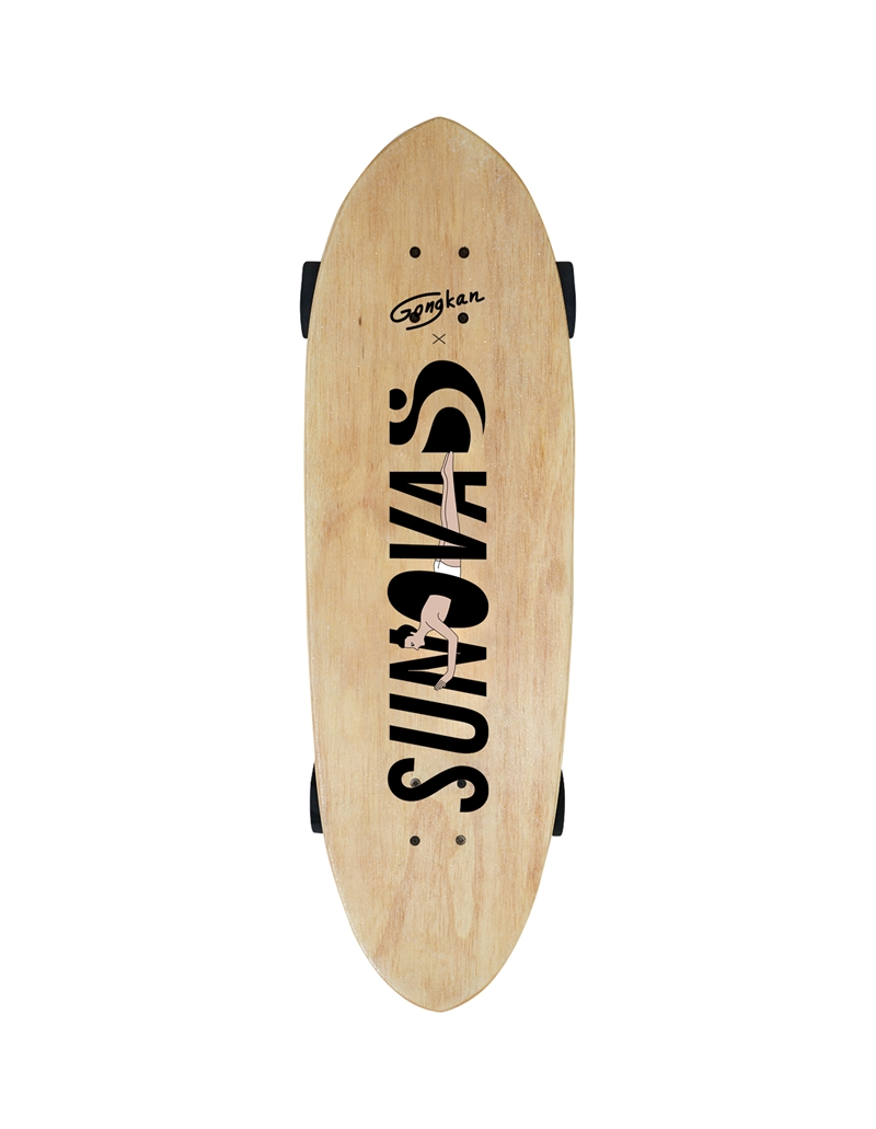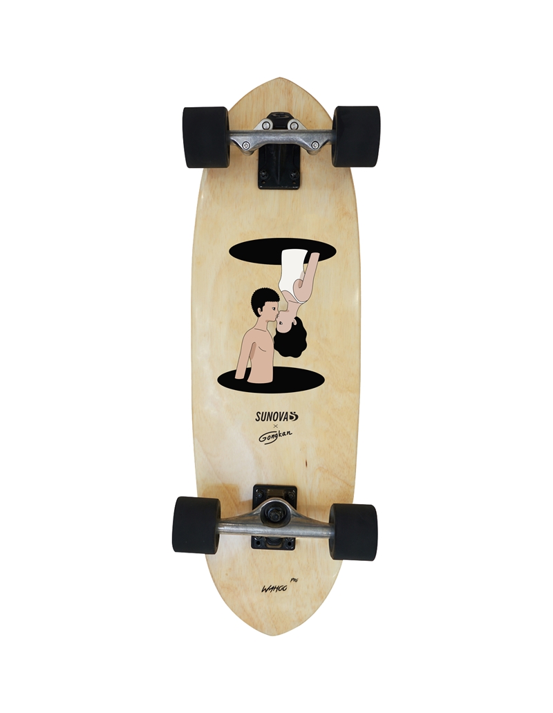 สำหรับลิมิเต็ดคอลเลคชั่นพิเศษที่รวมออกแบบกับ Gongkan (ก้องกาน) นี้ตัวเซิร์ฟสเก็ตจาก Sunova จะเป็นโมเดลใหม่ล่าสุดชื่อว่า “Wahoo (วาฮู)” ที่ยังไม่เคยวางจำหน่ายที่ไหนมาก่อน โดยโมเดลใหม่ล่าสุดนี้ถูกผลิตด้วยเทคโนโลยีแบบ Wood Sandwich ซึ่งคือการผสมกันระหว่างไม้ Paulownia กับ ไม้ยางพารา ใช้กระบวนการผลิตที่เหมือน Surfboards ทำให้มีเอกลักษณ์ที่ความเบา สามารถลอยน้ำได้ ลายไม้บอดที่เหมือนแผ่นเซิร์ฟ และเมื่อถูกน้ำแล้วตัวแผ่นเซิร์ฟสเก็ตจะไม่เละ ไม่พอง ทำความสะอาดง่าย
