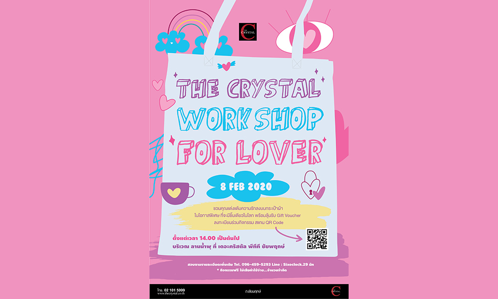 ในงาน THE CRYSTAL WORKSHOP FOR LOVER ร่วมสร้างสรรค์ผลงานในแบบของคุณกับการแต่งแต้มความรักลงบนกระเป๋าผ้าใบเก๋ เพื่อเป็นของขวัญพิเศษชิ้นเดียวสำหรับคนที่คุณรักในวันวาเลนไทน์ (ฟรีไม่ค่าใช้จ่าย) พร้อมลุ้นรับ Gift Voucher ผู้สนใจลงทะเบียนได้ที่ shorturl.at/ehDGY
