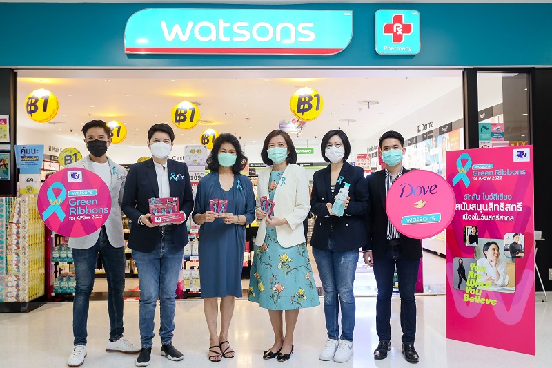 วัตสัน ผู้นำร้านเพื่อสุขภาพและความงาม อันดับหนึ่งของประเทศไทย จัดกิจกรรมจำหน่ายโบว์สีเขียวมอบรายได้จากการจำหน่ายทั้งหมดโดยไม่หักค่าใช้จ่ายให้กับสมาคมฯ ภายใต้แคมเปญ “Watsons Green Ribbons”  ซึ่งจัดขึ้นอย่างเป็นประจำต่อเนื่องทุกปีในวันสตรีสากล วัตสันร่วมรนณรงค์และสนับสนุนให้ผู้หญิงมีความเชื่อมั่น มั่นใจ สร้างคุณค่าให้ตัวเองและผู้อื่นได้ พร้อมเติมพลังบวกให้กับผู้หญิง นำโดย คุณนวลพรรณ ชัยนาม Customer Director วัตสัน ประเทศไทย (คนที่ 2 จากทางซ้าย) ร่วมกับ โดฟ เมื่อซื้อผลิตภัณ์โดฟชนิดใดก็ได้ เท่ากับบริจาค 5 บาท ร่วมสบทบทุนบริจาคให้แก่สมาคมส่งเสริมสถานภาพสตรี ในพระอุปถัมภ์ พระเจ้าวรวงศ์เธอ พระองค์เจ้าโสมสวลี กรมหมื่นสุทธนารีนาถ (บ้านพักฉุกเฉิน) นำโดย คุณหมอพรรณพิมล วิปุลากร นายกสมาคมส่งเสริมสถานภาพสตรีฯ (คนที่ 3 จากทางขวา) เพื่อช่วยเหลือ สนับสนุนเด็กและสตรีให้กลับมาใช้ชีวิตได้อย่างมั่นใจอีกครั้ง
