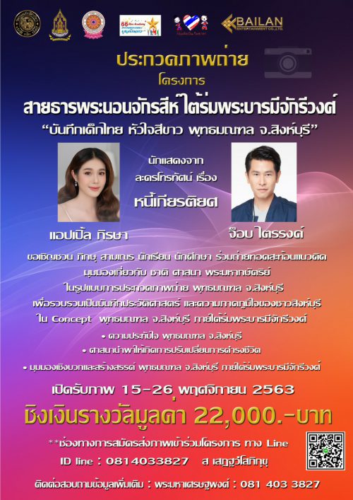 โดยนำเสนอความประทับใจ พระพุทธมณฑล วัดพระนอนจักรสีห์วรวิหาร จ.สิงห์บุรี ศาสนานำพาให้เกิดการปรับเปลี่ยนการดำรงชีวิต มุมมองเชิงบวกและสร้างสรรค์ ชิงเงินรางวัลมูลค่า 22,000 บาท เปิดรับภาพตั้งแต่วันที่ 16-26 พฤศจิกายนนี้เท่านั้นนะคะ สนใจสอบถามรายละเอียดได้ที่ ID LINE : 081-4033827 แล้วพบกับ แอปเปิ้ล และพี่ๆ เพื่อนๆ ศิลปินดารานักแสดงสายบุญในวันศุกร์ที่ 4 ธันวาคม ที่วัดพระนอนจักรสีห์วรวิหาร จ.สิงห์บุรี โดยจะเข้าร่วมพิธีเปิดในช่วงเช้า เวลา 10.00 น. และช่วงเย็นไปสนุกสนานกับเหล่าศิลปินดาราบนเวทีตั้งแต่ 18.00 น. เป็นต้นไปค่ะ”