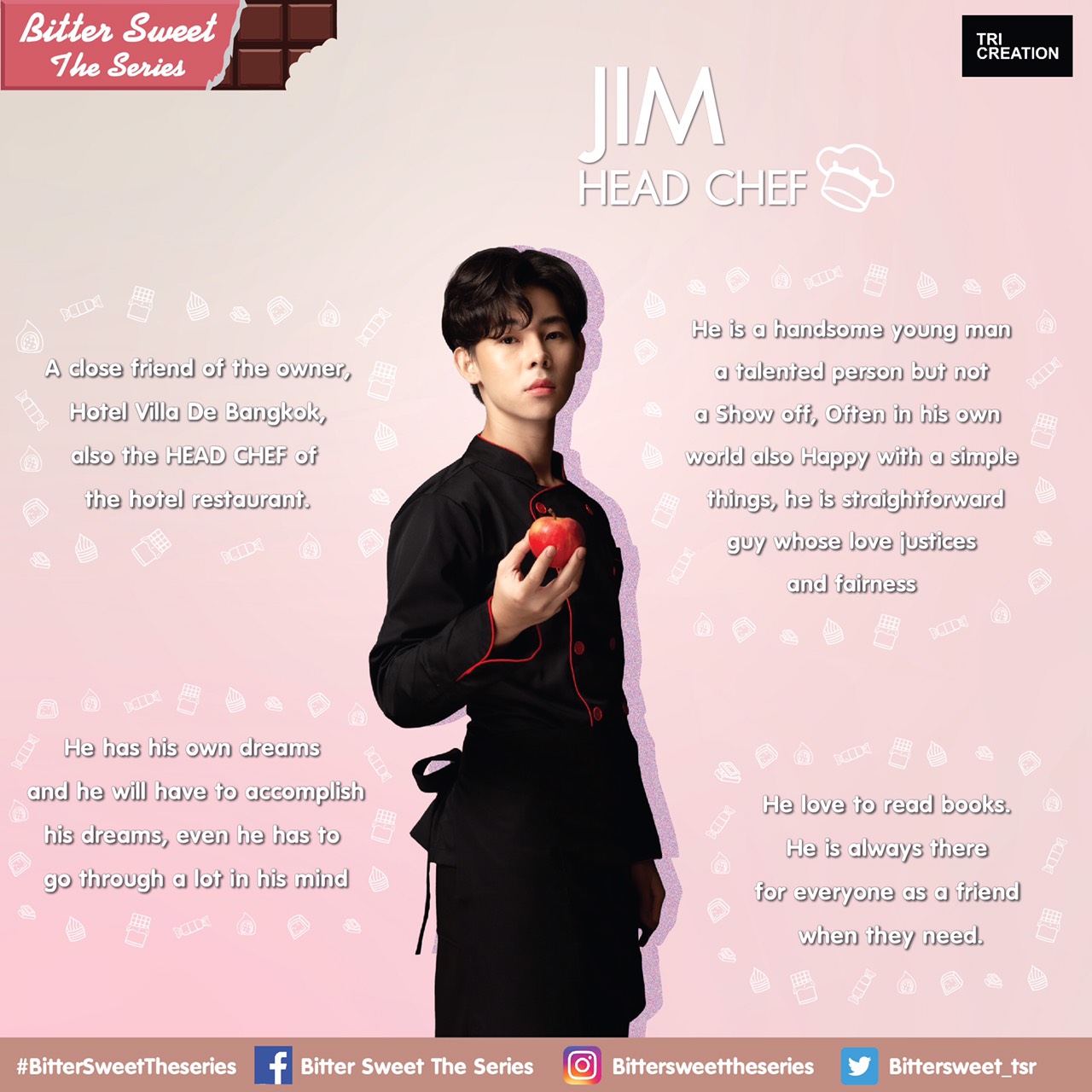 “จิม” จิมเป็นเพื่อนสนิทของผู้บริหารโรงแรม Hotel Villa De Bangkok และยังเป็น HEAD CHEF ประจำห้องอาหารของโรงแรมอีกด้วย ภายใต้ใบหน้ายิ้มแย้มนั้นใครจะรู้ว่าจริงๆ แล้วเค้าแบกรับและซ่อนความรู้สึกอะไรไว้ เค้ามักจะเป็นที่ปรึกษาให้กับทุกคนเป็น save zone ของเพื่อนๆ เค้าเป็นที่ระบายให้กับทุกคนในกลุ่ม แต่เค้าเองก็มีปัญหาส่วนตัวที่ไม่มีใครช่วยได้นอกจากตัวของเคัาเอง จิมมีความฝันและความมุ่งมั่นที่จะทำความฝันของเค้าให้สำเร็จให้ได้ แม้ว่าจะต้องเจออุปสรรคใดๆ ก็ตาม รับบทโดย “อินทัช-ณภัทร”