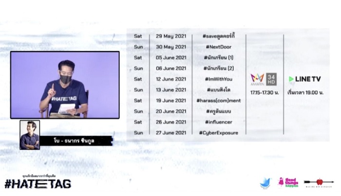 สามารถติดตามชมหนังสั้น โปรเจกต์ #HATETAG ทั้ง 10 เรื่อง ได้ทุกวันเสาร์ – อาทิตย์ เวลา 17.15 น. ทางอมรินทร์ทีวี HD ช่อง 34 เริ่มตอนแรก วันเสาร์ที่ 29 พ.ค. 2564 ดูออนไลน์ที่แรกบน LINE TV เท่านั้นเวลา 19.00 น. และ ติดตามรายละเอียดของโปรเจกต์ #HATETAG เพิ่มเติม ได้ที่ Facebook และ Twitter @hatetagtheproject และ Facebook : กองทุนพัฒนาสื่อปลอดภัยและสร้างสรรค์