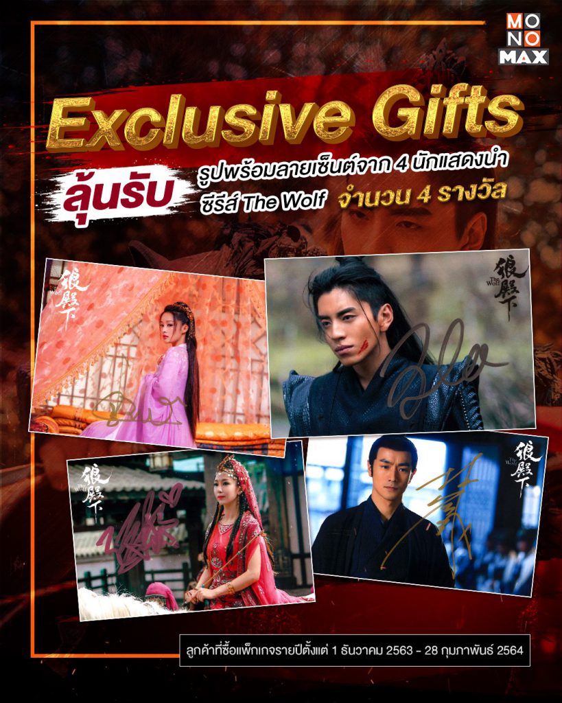 เดินหน้าเอาใจแฟนคลับอย่างต่อเนื่อง! หลังจาก “MONOMAX” (โมโนแมกซ์) ผู้นำดูหนังออนไลน์แบบถูกลิขสิทธิ์ ในเครือ โมโน เน็กซ์ ได้ลิขสิทธิ์ซีรีส์แฟนตาซีย้อนยุคฟอร์มยักษ์แดนมังกร “The Wolf หมาป่าจอมราชันย์ ฉบับพากย์ไทยมาฉายเป็นที่แรกและทีเดียวในเมืองไทยจนได้รับกระแสตอบรับล้นหลามไปแล้วนั้น! ล่าสุดได้จัดแคมเปญสุดพิเศษชวนคอซีรีส์สมัครแพ็กเกจรายปีสุดคุ้ม! โดยผู้ที่สมัครแพ็กเกจรายปีตั้งแต่วันที่ ธ.ค. 63 – 28 ก.พ. 64 นอกจากจะได้รับปลอกหมอนคู่สุดฟินจาก “The Wolf หมาป่าจอมราชันย์ แล้ว! ยังมีสิทธิ์ลุ้นรับของขวัญสุดพิเศษ Exclusive Gifts โปสการ์ดพร้อมลายเซ็นต์แท้! จาก นักแสดงในซีรีส์ “The Wolf หมาป่าจอมราชันย์ นำโดย หวังต้าลู่”, “หลี่ซิ่น, “กัวซูเหยา” และ หลินโหย่วเวย จำนวน 4 รางวัล รางวัลละ 4 รูป โดยประกาศรางวัลผู้โชคดี ท่าน ในวันที่ มีนาคม 2564 ผ่านทางเฟซบุ๊กแฟนเพจ MONOMAX งานนี้อย่ารอช้า! รีบสมัครลุ้นรางวัลสุดเอ็กซ์คลูซีฟกันดีกว่า! สอบถามรายละเอียดที่ www.monomax.me  หรือโทร 02-100-7007