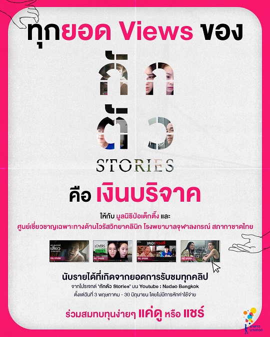 นาดาว บางกอก ผู้ผลิตหนังสั้น VDO CALL “กักตัว Stories” หนังสั้น 10 เรื่อง จาก 10 ผู้กำกับ ที่ฉายให้ชมกันทาง Youtube Channel NadaoBangkok ทุกวันอังคาร และศุกร์ ตลอดเดือน พฤษภาคม และ มิถุนายน เตรียมนำรายได้จากยอดผู้ชมในยูทูป ไปมอบให้กับ มูลนิธิป่อเต็กตึ๊ง และ รพ.จุฬาฯ
