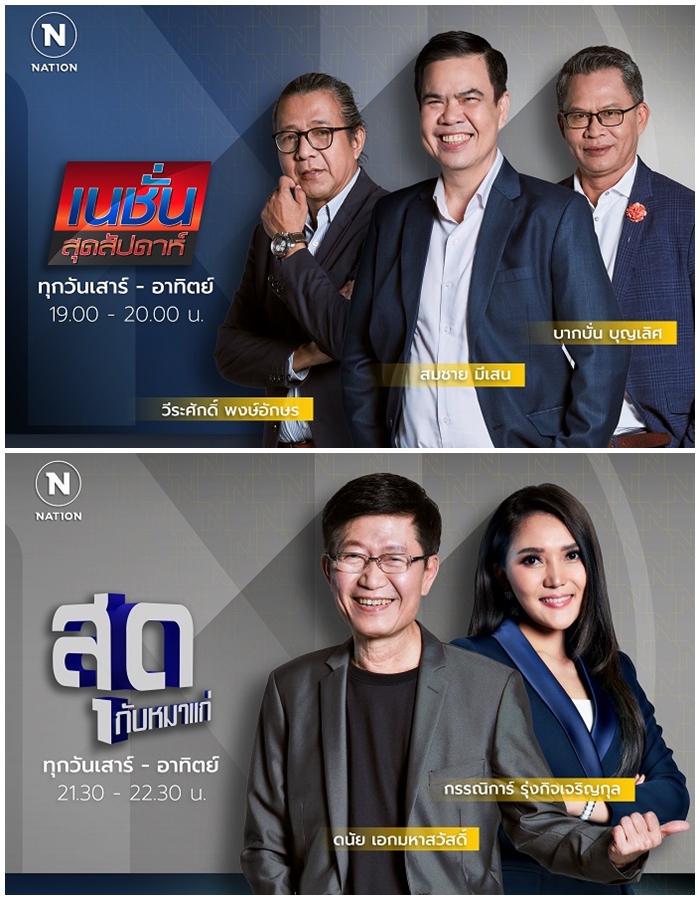 เนชั่นสุดสัปดาห์ : ทุกวันเสาร์และอาทิตย์ เวลา 19:00-20:00 น. คลุกวงในการเมือง ร่วมพูดคุยผ่านมุมมองสื่อมวลชนอาวุโสมากประสบการณ์ กับ สมชาย มีเสน, วีระศักดิ์ พงษ์อักษร และ บากบั่น บุญเลิศ ทุกแง่มุมการเมืองที่คุณอย่างรู้เรามีคำตอบ
