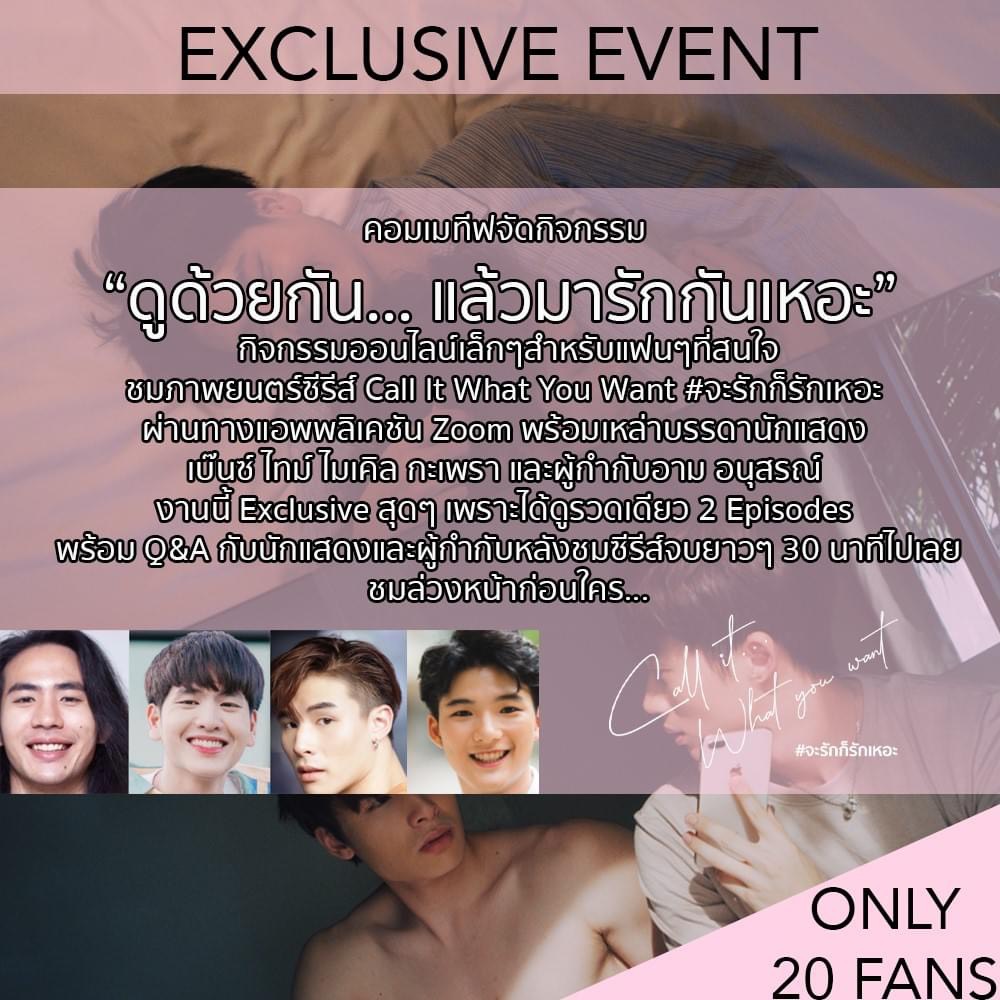 ค่ายคอมเมทีฟร่วมกับ GAGAOOLALA จัดกิจกรรม “ดูด้วยกัน… แล้วมารักกันเหอะ” กิจกรรมดูซีรีส์เรื่องแรกของโลกที่ร่วมทุนรหว่างประเทศไทยและไต้หวัน ‘Call it what you want’ จะรักก็รักเหอะ ครั้งแรกบนช่องทางออนไลน์ สำหรับแฟน ๆ ที่สนใจชมภาพยนตร์ซีรีส์ ผ่านทางแอพพลิเคชัน Zoom พร้อมเหล่าบรรดานักแสดงนำของเรื่อง “เบนซ์ ภาณุพันธ์ วงศ์จร” “ไทม์ ธามวัสน์ สันธนะพันธ์” “ไมเคิล เกียรติศักดิ์ วัตนวิทย์สกุล” “กะเพรา พงศ์กรณ์ วงศ์กฤติยารัฐ” และผู้กำกับ อาม อนุสรณ์ งานนี้ Exclusive สุด ๆ เพราะได้ดูรวดเดียว 2 Episodes พร้อม Q&A กับนักแสดงและผู้กำกับหลังชมซีรีส์จบยาวๆ 30 นาทีไปเลยแถมยังได้ชมล่วงหน้าก่อนใคร… สามารถติดตามรายละเอียดได้ที่ https://www.facebook.com/101785858198354/posts/261510808892524/?d=n
