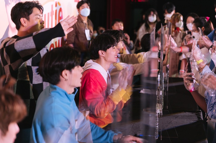 หลังจากพูดคุยเสร็จ ก็เข้าสู่ช่วงการเล่นเกมส์กับแฟนคลับทำเอาแฟนคลับกว่า 600 คน ในโรงภาพยนตร์ภาวลัย จิ้น ฟิน นั่งแทบไม่ติดเก้าอี้ ต่อจากนั้น ก็เสิร์ฟความน่ารักกันต่อกับ 2 หนุ่มจิ้น คู่ใหม่ “ติวเตอร์ – ยิม” กับเพลง “เอาปากกามาวง” ไปต่อกันแบบไม่ให้เสียเวลากับคู่ พี่แม้ก – น้องณฐ ที่เอาเพลง “เผลอหรือตั้งใจ” มาร้องให้กับแฟนคลับคู่นี้ได้กรี๊ดในความน่ารักของทั้งคู่ และถึงเวลาของคู่หลักที่ทุกคนรอคอย “เฮียหลียน – หนูเกื้อ” (ซี – นุนิว) ที่มาพร้อมกับเพลง “คลั่งรัก” เหมือนเป็นการประกาศให้รู้ว่าทั้งคู่คลั่งรักกันมากขนาดไหน หลังจากนั้นก็เบรกความหวานของทั้ง 3 คู่ เพื่อมาพบกับความน่ารักของหนุ่มๆ ทั้ง 12 คน จากค่าย “ดูมันดิ” ในเพลง “หากเธอเคยรักใคร” ที่ทำเอาแฟนคลับทุกคนขยับมือ เต้นตาม เพราะเป็นเพลงฮิตที่มาพร้อมกับท่าเต้นน่ารักๆ ที่ทุกคนสามารถเต้นตามได้ ต่อด้วยทั้ง 12 หนุ่มฝากผลงานของแต่ละคน และฝากให้ทุกคนได้ติดตามซีรีส์ “นิ่งเฮียก็ว่าซื่อ”